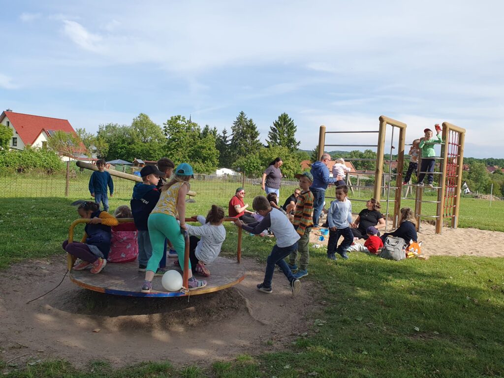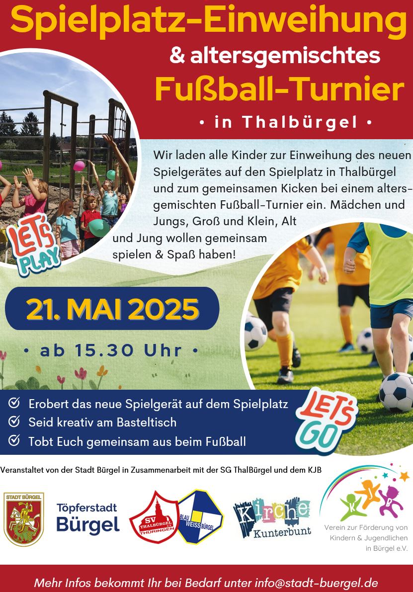 Am 21. Mai 2025 durften wir ein kleines Fest zur feierlichen Einweihung eines neuen Spielgerätes auf dem Spielplatz in Thalbürgel ausrichten. Gemeinsam mit unseren befreundeten Vereinen aus Bürgel und Thalbürgel gelang uns ein bunter und abwechslungsreicher Nachmittag für alle Generationen. Mit der Abteilung Fußball der SG ThalBürgel organisierten wir ein Fußball-Turnier auf dem angrenzenden Sportplatz. Die Kinderkirche Kunterbunt verzierte kleine und große Gäste mit wunderschönen Glitzer-Tattoos und unser Förderverein bot neben der Versorgung der Gäste auch kreativen Bastelspaß und kleine Spaß- und Bewegungsspiele. Bürgermeister Sebastian Förster eröffnete im Laufe des Nachmittags das neue Klettergerüst, welches auch sofort von allen kleinen und großen Besuchern gestürmt und ausgetestet wurde.